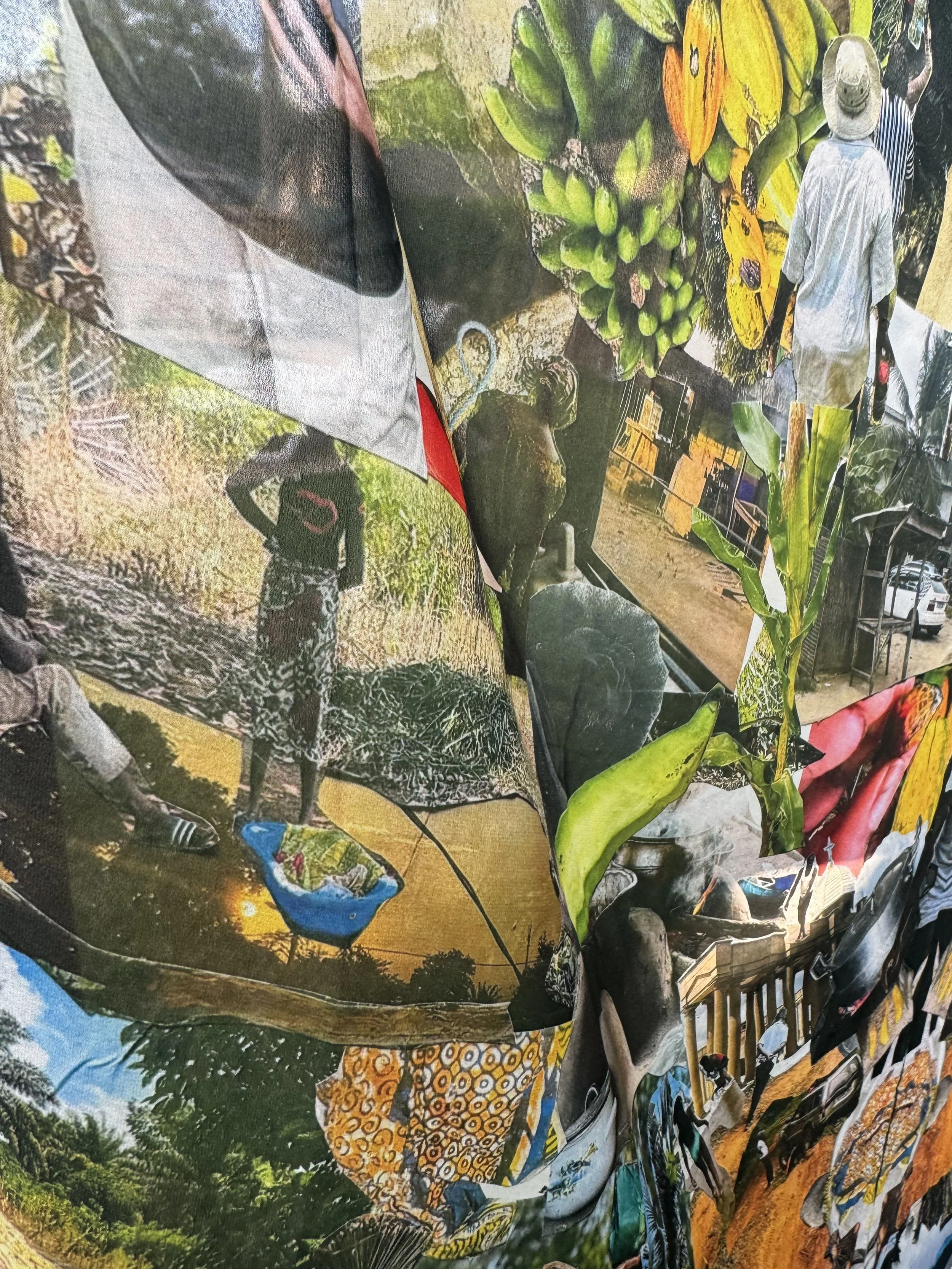 Roots in Frame is an immersive installation by Blya Krouba and Cat Martinez that explores the West African origins of shotgun houses, highlighting the profound historical ties, architectural lineage, and cultural continuity of the African diaspora. Using photographs on organza fabric, Krouba creates a narrative of lived experiences of African and African American family life framed by a life-sized steel structure by Martinez that references the quintessential Southern vernacular style of architecture. The project collocates both voluntary and forced migration, showcasing how these histories shape community and identity. By blending traditional and modern elements, Roots in Frame celebrates the resilience and unity of African and African American cultures, creating a dialogue that explores cultural identity and family life across continents.
