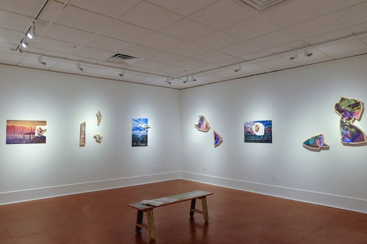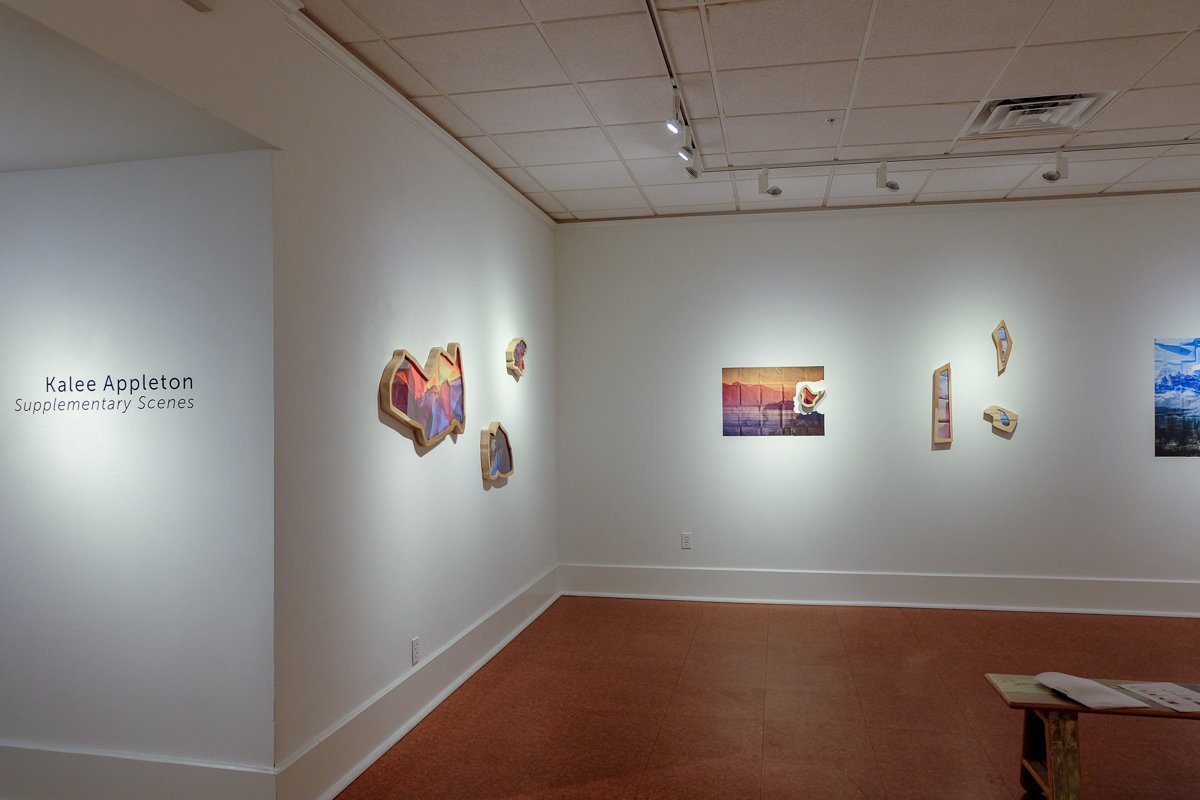 Kalee Appleton’s work deals with the nature and materiality of photography through the enduring tradition of landscape photography. Supplementary Scenes explores the objectivity of idealized landscapes and utopian worlds depicted in the photographic backdrops commonly used in mainstream photography studios. Like many photographs throughout history, these objects force viewers to question truth and contemplate the mechanical nature of photography, as the pure purpose of these backdrops is to exist as a false contextual object in the aid of transporting a sitter to an idealized world. The imagery produced not only acts as a supplemental scene to a portrait, but also exists to fulfill the desires of the commissioners and sitters of the portrait. Appleton skews and distorts perceptions of space, transforming these backdrops into the sculptural subjects of her photographs. The medium is further pushed into the sculptural realm with irregularly shaped frames. Imagery either responds to the grain of the wood frame or follows the perimeter of the folded landscape, pulling the photograph from the gallery wall while depicting the 3D altered landscape on a 2D surface.